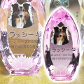 しずく型の側面がダイヤカットされた美しいクリスタルペットお位牌です。写真をそのままフルカラーで印刷。写真だけでなくお名前やメッセージも印刷できるので